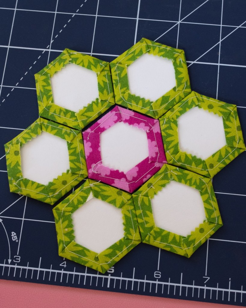 This is a great place to see the rhythm of EPP. How to thread baste EPP and how to join the pieces together to create a hexie flower.